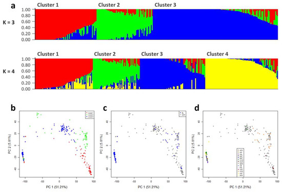 To understand the structure of the cucumber germplasm collection, a structure analysis of ten independent runs was performed with K values from 1 to 10. Based on the genetic clustering algorithm model, the ΔK method determined that the best K is 3 for the SNP dataset. This result indicated that three subpopulations represent the best number of clusters for the cucumber germplasm collection used in this study. Cluster 1, cluster 2, and cluster 3 included 67, 61, and 136 accessions, respectively (Figure 2a and Table S3). It is interesting to note that at K = 4, which is not the best option of the clustering, cluster 3 in K = 3 was divided into breeding lines and germplasm, which is similar to the results seen in the PCA and the phylogenetic analysis (Figure 2).