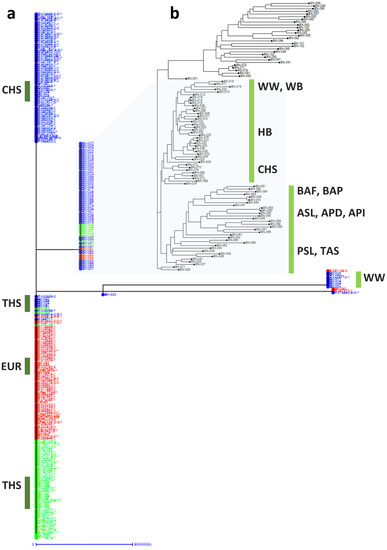 - Pritchard, J.K.; Stephens, M.; Donnelly, P. Inference of Population Structure Using Multilocus Genotype Data. Genetics 2000, 155, 945–959. [Google Scholar] [CrossRef] [PubMed]