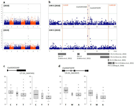 Significant SNPs and candidate genes correlating cucumber PM resistance from GWAS. The green horizontal line in the Manhattan plots indicate the significant threshold based on the Bonferroni correction. The position of the candidate genes and the reported genes are indicated by red dotted lines with the names. Under the chromosome-wide Manhattan plot, reported QTLs are represented by gray boxes. (a) Genome-wide association under 2018 and 2019 experimental year, respectively; (b) distribution of the significant SNPs and candidate genes on chromosome 5 with the reported genes and QTLs; (c,d) gene structure of candidate genes to PM with DNA polymorphism. Below the gene structure, boxplots show PM resistance index by years based on allelic differences of significant SNP; left from 2018, right from 2019; the width of each box is proportional to the square root of the number of accessions.
