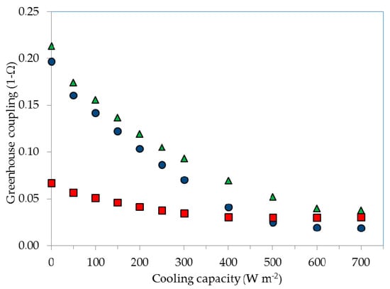 Coupling factor (1–Ω), as affected by the capacity of the cooling system. The simulations were done for a greenhouse with a dehumidification system with tomato cultivation all year round for three areas. Triangles: Algeria; circles: Greece; squares: The Netherlands [].