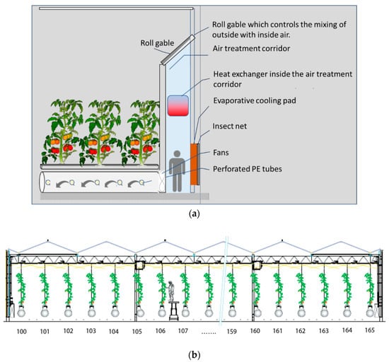 Main components of a semi-closed greenhouse equipped with air treatment corridor and perforated tubes: (a) 2D graphical presentation of the air treatment corridor and perforated tubes, (b) vertical cross section of greenhouse equipped with perforated tubes below the crop gutters. The numbers indicate the row number parallel to plant width [].