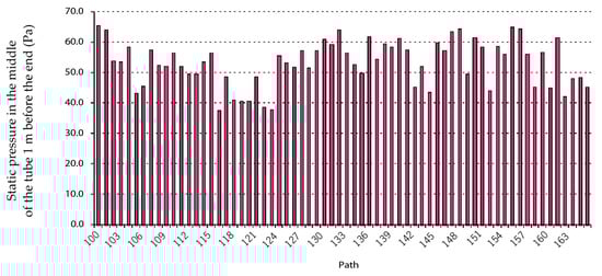 The relative magnitudes of these processes determine whether over any section of tube there is a net increase or decrease in the static pressure. Obviously, the uniformity of the air pressure between different tubes of the same greenhouse compartment is important for the proper operation of the system. However, while this is considered to be the case, it is not always true. The static pressure measured in the center of the cross section of perforated tubes, one meter before their end in several rows in a tomato greenhouse is presented in Figure 3 [], indicating that differences can occur in commercial greenhouses.