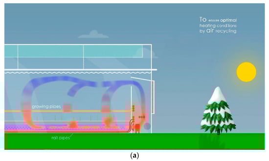 The closed or semi-closed greenhouse concept is widely accepted as a concept to achieve the above-mentioned targets for energy saving and for reducing CO2 emissions. The energy saving is achieved by reduction of losses mainly due to less ventilation, due to partly diurnal and partly seasonal-phase shift of heating (or cooling) usage and heat (or cold) storage (if a seasonal storage is used) and due to additional use of technical equipment (humidifiers, air conditioners, heat exchangers, fans, etc.) []. It also allows temperature, humidity, and CO2 concentration to be controlled independently for different control modes (e.g., during heating, cooling, dehumidification, etc.). This makes it possible to achieve different combinations of climatic conditions that were not possible until now in conventional greenhouses. For example, conditions of high light intensity plus high CO2 concentration, and a low rate of CO2 supply are possible only in a closed or semi-closed greenhouse [,].