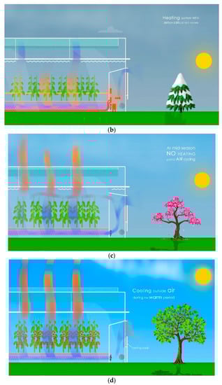Graphical presentation of the semi-closed greenhouse with an air treatment corridor functioning under different climate conditions and modes. (a) Dehumidification and heating of internal air, (b) dehumidification and heating of outside air, (c) mixture of internal and outside air, (d) cooling of outside air.