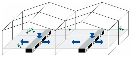 In the case of the semi-closed greenhouses with decentralized air treatment systems, there is no air treatment corridor and central cooling system but only air coolers/dehumidifiers distributed inside the greenhouse (Figure 6). The distributed air treatment units may be located above or below the crop. When the crop is cultivated on benches, the air treatment units are usually located below the crop, while for the rest of the cases they are usually located above the crop. The distributed air treatment units cool, dehumidify, and redistribute the air locally without using an air distribution system. In the case of semi-closed greenhouses with distributed air treatment units, the greenhouse has no evaporative cooling system and the cooling needs are completely covered by conventional coolers. In addition, compared to the case of a semi-closed greenhouse with air treatment corridor, no overpressure can be created inside a semi-closed greenhouse with distributed air treatment units.