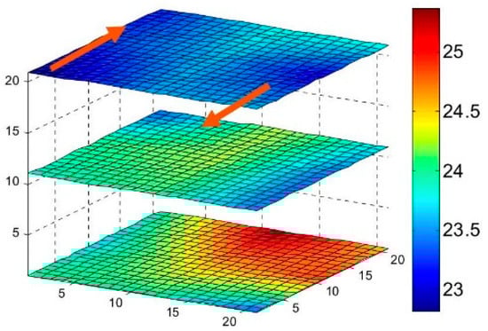 Temperature (°C) map during cooling periods. Measurements recorded for a repeatable section of a greenhouse at three heights where top coolers were used to condition the air. The arrows in the figure indicate the direction of the air as it flows from the heat exchanger [].