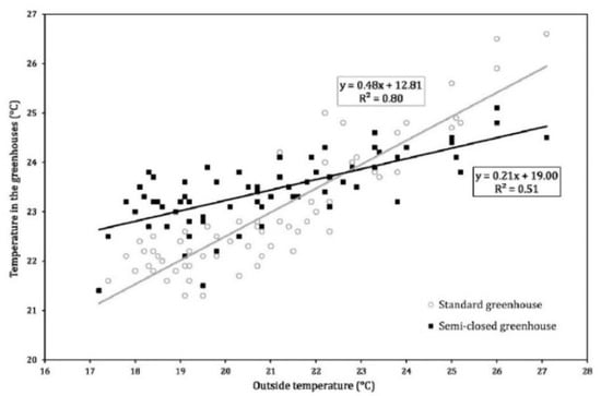 Depending on the degree of climate control and the equipment used, the microclimate inside a conventional, naturally ventilated greenhouse is affected by the greenhouse structure and vent configuration and many other factors such as the outside air velocity, temperature, and humidity [,]. On the other side, by principle, in a semi-closed greenhouse the natural ventilation is limited, and a conventional cooling system is used in order to keep the greenhouse as much as possible ‘closed’ and decoupled from the outside environment. By increasing the capacity of the cooling system, the greenhouse microclimate becomes less dependent on outside climate and more similar to what is required (control set-points) and the ‘region’ effect disappears [], however energy consumption increases with cooling capacity increase. Comparison of the daily average air temperature inside a semi-closed and a conventional greenhouse (Figure 8) shows that the microclimate inside a semi-closed greenhouse is less dependent on the outside climate and more stable than in the conventional greenhouse [].