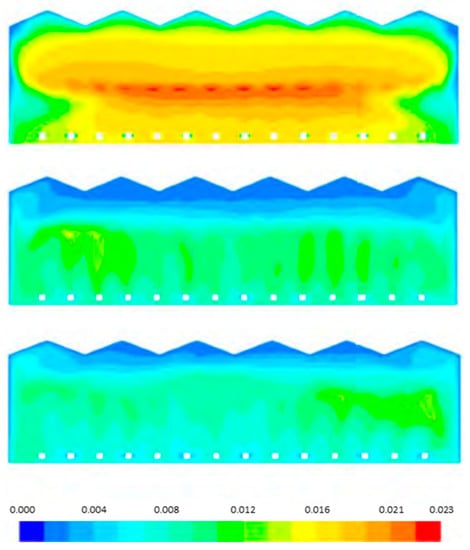 Simulated water vapor concentration (kg kg−1) in a median plane at 4:00 pm for airflow rates in the ducts equal to Q (=7.6 m s−1) (top), 2Q (middle), and 3Q (bottom) [], (the legend has been adjusted based on the manuscript of []).
