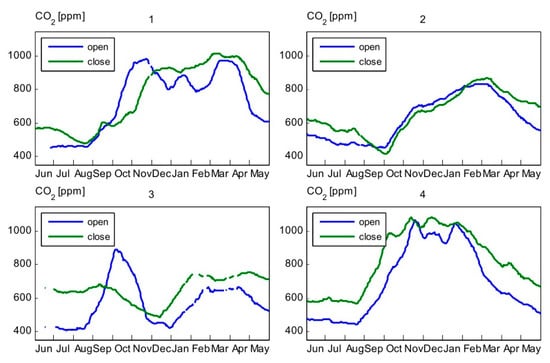 Daily average CO2 level during daylight for open and closed greenhouses of four tomato growers in The Netherlands during a year-round period [].