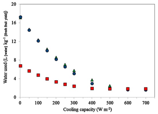 Water used (L of water per kg fruit yield) estimated for year-round tomato cultivation vs. greenhouse cooling system capacity. Triangles: Algeria; circles: Greece; squares: The Netherlands [].