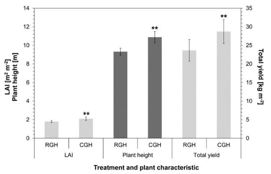 Growth and total yield of a tomato crop grown under a conventional (RGH) and a semi-closed (CGH) greenhouse [] (bars mean standard deviations and asterisks significant differences according to the t-test procedure at a significance level α = 0.05 and ** α = 0.01).