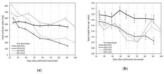 A total of 1426 seed yield measurements were obtained from the 1496 attempted harvests in 2015 (187 plants × 8 harvests) and a total of 520 seed yield measurements were obtained from 1309 attempted harvests in 2017 (187 plants × 7 harvests). At least four successful harvests were taken from 182 plants in 2015 and at least one successful harvest was taken from 107 plants in 2017. A total of 1946 seed yield measurements were obtained over both years with at least 4 harvests on 184 of the 187 plants including 104 plants with the Ltc096 t/t genotype and 80 plants with the c/t genotype. Significant (p < 0.0001) effects of year, genotype, harvest date (year), and genotype × harvest date (year) terms were detected for seed yield per spike, seed mass, and the number of seeds per spike with no significant (p > 0.05) effect for the genotype × year terms. Significant (p < 0.0001) effects of year, genotype × year, and harvest date (year) terms were detected for spike length with no significant (p > 0.05) effects for the genotype × year or genotype × harvest date (year) terms.