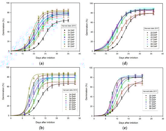 The upper percentage germination limits, , were significantly higher at later harvest dates compared to earlier harvest dates in 2015 (Table 1) and 2017 (Table 2). In 2015, the average upper germination limit of seed harvested on the last harvest date (87.1%) was approximately 26.4% higher than seed harvested on the first date (68.9%) across three different germination tests (Table 1). In 2017, the average upper percentage germination of seed harvested on the last harvest date (85.7%) was approximately 14.0% higher than seed harvested on the first date (75.2%), across three different germination tests (Table 2). Thus, the upper percentage germination limit of seed harvested on the last harvest date was approximately 20.5% higher than that for seed harvested on the first harvest date. The upper percentage germination limits of cold-stratified seed tended to be lower across different harvest dates in 2015 (15_GT1, Table 1), whereas they tended to be higher after a period of extended storage of 1025 DAP in 2015 (15_GT3, Table 1) except for the earliest harvest, 24 DAP, which was noticeably lower in all three tests (Table 1; Figure 2a–c). However, there were no consistent differences in the upper germination limits among the three different tests (17_GT1, 17_GT_2, or 17_GT3) conducted for seed harvested in 2017 (Table 2).