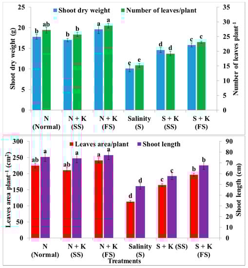- El-Lethy, S.R.; Abdelhamid, M.T.; Reda, F. Effect of potassium application on wheat (Triticum aestivum L.) cultivars grown under salinity stress. World Appl. Sci. J. 2013, 26, 840–850. [Google Scholar]