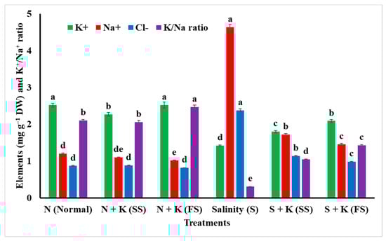 - Chakraborty, K.; Bhaduri, D.; Meena, H.N.; Kalariya, K. External potassium (K+) application improves salinity tolerance by promoting Na+-exclusion, K+-accumulation and osmotic adjustment in contrasting peanut cultivars. Plant Physiol. Biochem. 2016, 103, 143–153. [Google Scholar] [CrossRef]