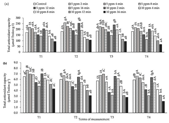 Changes in the total antioxidant capacity (AA) in potato leaves depending on O3 concentration, exposure time and measurement terms (T1—1st day after the 1st fumigation, T2—7th day after the 1st fumigation, T3—1st day after the 2nd fumigation, T4—7th day after the 2nd fumigation); (a) method with ABTS•+ radical, (b) method with DPPH• radical. Lowercase letters indicate significant differences between the means at respective measurement terms, capital letters indicate significant differences between means at the measurement terms for the respective variants of O3 concentration and exposure time (p < 0.05).