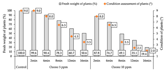 Although O3 is toxic to plants due to its strongly oxidizing properties leading to reduced photosynthesis, growth inhibition, and, consequently, reduced crop yields (Ueda et al., 2013), it could be used as an alternative and ecological biocidal agent. Properly selected doses and O3 exposure time can also be taken into account in plant protection [6,9].