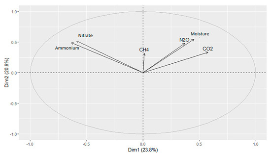 The principal components analysis for GHGs emissions and explanatory variables identified that there was a clear positive correlation between soil moisture, and CO2 and N2O emissions. Soil ammonium and nitrate were also correlated with these gases. However, soil CH4 was not correlated with the variables (Figure 1). The CCA was performed to identify linear correlations between the grouping identified in the PCA analysis. The CCA showed the correlation between N2O and CO2 of 0.38 and with moisture of 0.48. The correlation with ammonium and nitrate was negative −0.53 and −0.49, respectively.