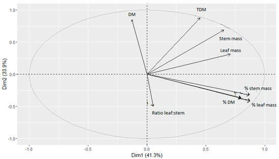 Principal component analysis (PCA) was obtained from a correlation matrix using the R package “FactoMineR” (http://factominer.free.fr/). The categories analyzed were: (1). Forage mass and structure (Dry matter mass, leaf mass, stem mass, dead material mass, % of leaf, % of stem, % of dead material, and leaf/stem ratio), and (2) Nutritive value (Organic Matter%, CP%, NDF%, and lignin% of DM),