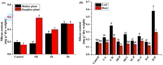 The Si content in different tissues of strawberry plants after being treated with Si. (A), Si content in leaves of mother or daughter plants before cutting propagation; (B), Si content in leaves or roots after cutting propagation. Lowercase letters indicate significant differences calculated by Duncan’s multiple range test at p ≤ 0.05. Vertical bars indicate the standard error (n = 3). The letters before the hyphen indicate Si being applied before the cutting propagation, while the letters after the hyphen represent Si being supplied after the cutting propagation. C, control; SR, spraying the runners; SL, spraying the leaves; Dr, drenching the roots; D, drenching the roots; 0, spraying distilled water; S, spraying the leaves.