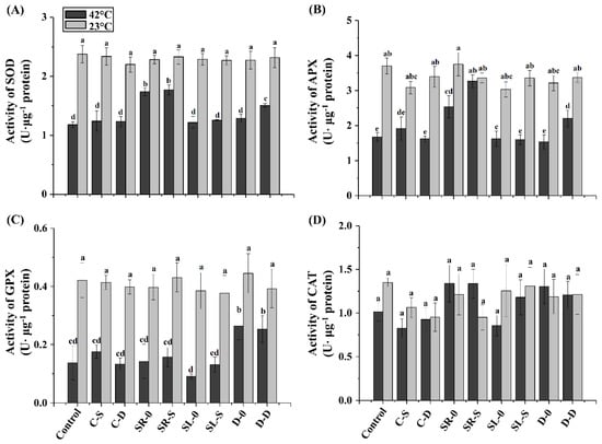 The activities of the antioxidant enzymes in leaves under a high temperature stress or normal temperature for 1 week were analyzed. The activities of SOD, APX, and GPX were significantly decreased while CAT did not change under high temperature stress compared with unstressed plants (Figure 4). However, the activities of SOD and APX in SR-0, SR-S, and D-D were significantly promoted compared with those in the control under high temperature stress (Figure 4A,B). The activities of GPX were higher in D-0 and D-D under 42 °C (Figure 4C). There were no significant differences for the activities of CAT in plants treated with or without Si under the high temperature (Figure 4D).