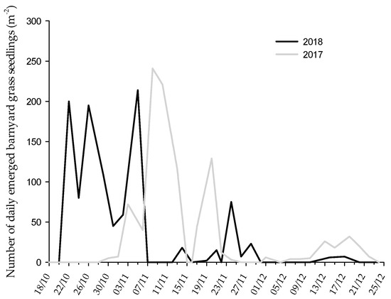 The number of emerged barnyard grass seedlings differed between the sowing seasons and cultivation years monitored (Figure 1). However, in the two years, the highest emergence rates of barnyard grass occurred in the first sowing times. These rates were 46.5% and 65.0% higher than those of the second half of November, in 2017 and 2018, respectively.