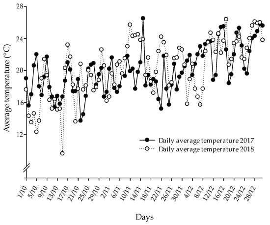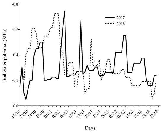 The years 2017 and 2018 differed considerably in rainfall (data not shown) and soil temperature (Figure 2) at the evaluated months. The year 2018 had colder temperatures in October and at the beginning of December in comparison to the year 2017. However, the month of November was hotter in 2018 than in 2017. The rainfall events occurred during 11 and 13 days for each year, maintaining the soil water potential on better conditions (upper to −0.4 MPa) (data not shown) 56 and 48 days for 2017 and 2018, respectively (Figure 3).