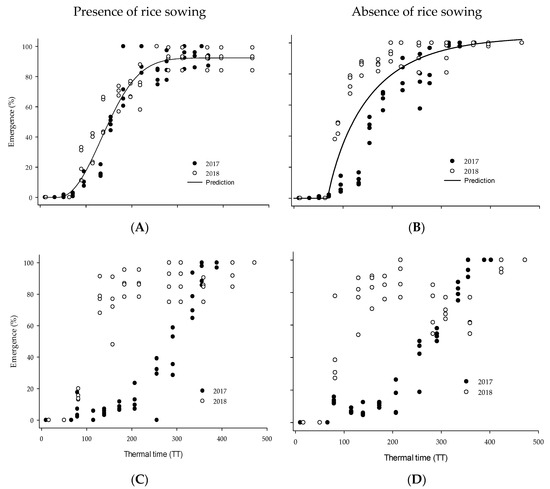 Several models simulate weed emergence in crops such as corn (Zea mays L.) [5,6], soybean [Glycine max (L.) Merrill] [7,8], and winter cereals (Galium spp., Thlaspi arvense L., and Lolium rigidum Gaud.) [9,10,11]. However, researchers have developed few models for rice (Oryza sativa L.) [12]. These models are often based on thermal (TT) and/or hydrothermal (HT) time [5,8], and require estimation of biological parameters such as base temperature (Tb) and base water potential (Ψb) for germination.