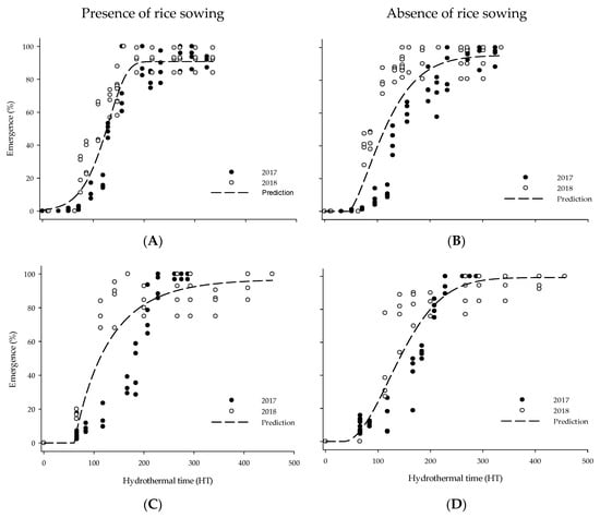 Hydrothermal time (HT) models improved the accuracy of the predictions of the thermal time (TT) model in sites with periods of water deficit [25], but their use may extend to some species under adequate soil water availability [8]. The HT model was also more accurate than the TT model for barnyard grass emergence in different regions of Italy [24], and for other species such as Lolium rigidum Gaud. [11] and Conyza bonariensis (L.) Cronq. [26].