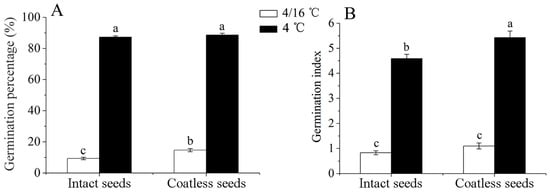 The germination percentage (A) and germination index (B) of intact seeds and coatless seeds of Tulipa thianschanica at a constant temperature of 4 °C and a fluctuating temperature of 4/16 °C. The different lowercase letters indicate a significant difference at p < 0.05 with Duncan’s multiple range test.