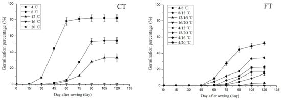 Effects of constant temperatures (CT) and fluctuating temperatures (FT) on the seed germination of Tulipa thianschanica. Different lowercase letters indicate a significant difference at p < 0.05 with Duncan’s multiple range test.