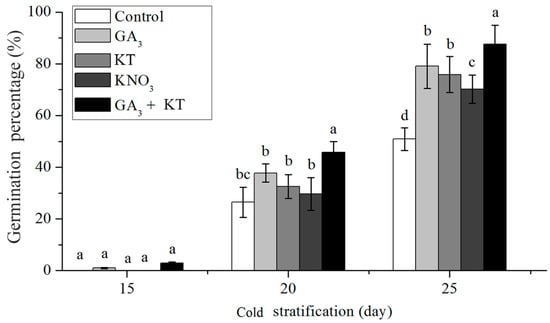 Cold stratification was an effective way of breaking the seed dormancy of T. thianschanica. Few seeds germinated when stratified for 15 days at 4 °C regardless of any other treatment (Figure 4). After 20 days of cold stratification at 4 °C, only <27.5% seeds germinated in the control and 38.6%, 34.2% and 31.2% seeds germinated with treatments of GA3, KT and KNO3 alone, respectively. The highest seed germination was recorded in GA3 + KT (47.5%). There was 50.0% germination after 25 days, but >70.0% of the seeds germinated when exogenous hormone was added, i.e., germination increased by nearly 1.5 times of the control (52.6%).