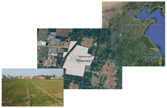 The village chosen for the study was Wangzhuang village in Quzhou County in the NCP (36°51′55″ N; 115°02′06″ E). The cropped area of the village covered approximately 177 ha and comprised a total of 540 fields, with an average farm size of 0.33 ha (Figure 1). The village is part of the Science and Technology Backyards (STB) initiative. The STB was established originally in Quzhou County in 2009 by China Agricultural University to carry out specific research and extension services aimed at transferring research technology to smallholder farmers [18]. The main cropping system of the village was winter wheat (Triticum aestivum L.) (sown in October) and summer maize (Zea mays L.) (sown in mid-June), with irrigation used by farmers on both crops. The soil was classified as silty-loam [20] and no significant slopes were present. The 2008–2018 weather had a mean, maximum and minimum air temperature during the growing season of 9.7, 15, and 4.3 °C, respectively.