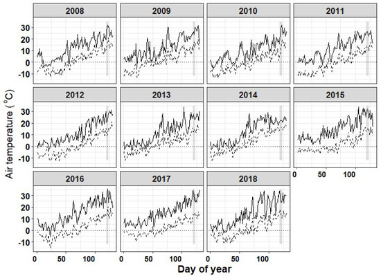 Maximum (full black line) and minimum (dotted black line) air temperature recorded at the Wangzhaung village from 2008 to 2018 from January to mid-May. The horizontal dotted line represents the 0 °C threshold while the vertical grey box represents the time when satellite images were acquired.