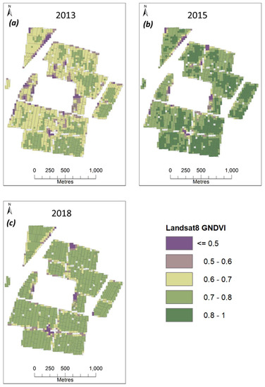 Calculated GNDVI for LANDSAT 8 scenes for growing season (a) 2013; (b) 2015; and (c) 2018. LANDSAT 8 scenes were obtained for late April/early May from 2013 to 2018. There were no scenes available from 2012.