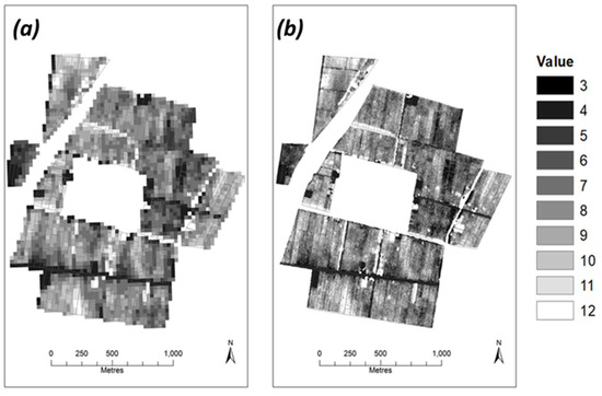 Soil brightness image (a) for 2017 resampled to match the LandSat8 spatial resolution (30 m) and (b) the original soil brightness image (3 m resolution).