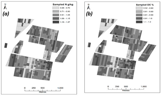 Measured values of (a) soil nitrogen content (g/kg) and (b) soil organic carbon (%) at the field scale.
