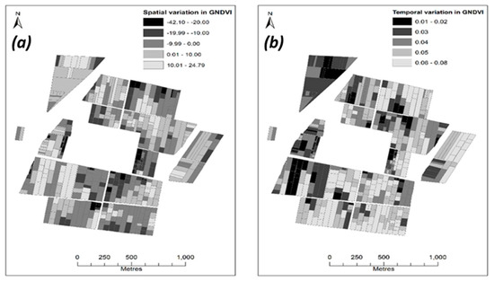 Ten-year time-series of GNDVI decomposed into (a) spatial variance and (b) temporal variance.