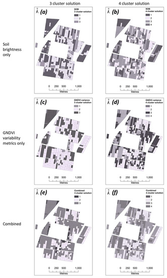 Results of clustering at field scale using (a,b) soil brightness alone; (c,d) the GNDVI variability metrics and (e,f) both combined, testing three and four cluster solutions.