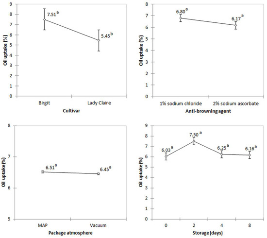 Oil uptake in fried fresh-cut potato as affected by cultivar, anti-browning agent, packaging and storage duration. Results are expressed as mean ± SE of n = 16 for cultivars, anti-browning agents, package atmospheres and n = 8 for days. Values with different letters are statistically different at p ≤ 0.05.