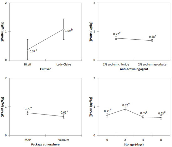 ΣPAH4 in fried fresh-cut potato as affected by the cultivar, anti-browning agent, packaging and storage duration. Results are expressed as mean ± SE of n = 16 for cultivars, anti-browning agents, package atmospheres and n = 8 for days. Values with different letters are statistically different at p ≤ 0.05.