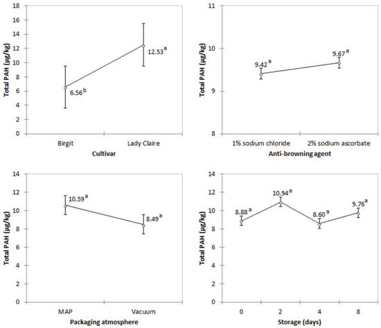 Total PAH content (Figure 3) was also significantly influenced by cultivar, with levels being twofold higher in cv. Lady Claire samples (12.53 vs. 6.56 µg kg−1).
