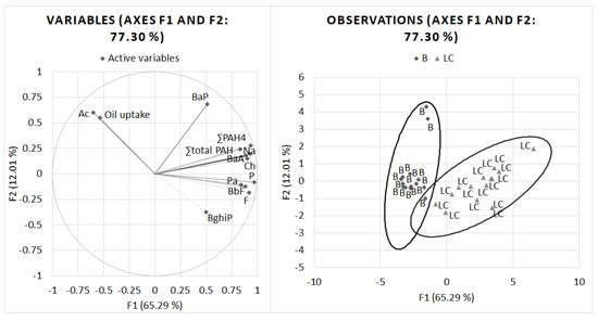 To further examine and visualise the interrelationship of determined differences in PAH species between cultivars included in this study, PCA was implemented (Figure 4). Based on the preliminary PCA, a total of 13 active variables with a communality value ≥0.5 were selected. PCA run included 32 observations and identified two main factors with eigenvalues of 8.488 and 1.561, respectively, which accounted for 77.30% of total data variance. First factor (F1) represented 65.29% of total variance and very strongly positively correlated with the majority of light fraction PAH species and all components from the heavy fraction as well as with sums of total PAH and PAH4. Acenaphthene was the only light PAH that had a positive correlation with the second factor (F2) which was also positively correlated with one heavy PAH, i.e., benzo(a)-pyrene and also with the oil uptake. F2 accounted for 12.01% of total variance. Furthermore, from the observations (samples) layout on the factorial plane (F1 × F2) differential distribution can be noted. The 95% confidence ellipses were also plotted around the means and clearly show grouping of cv. Lady Claire samples in the positive and cv. Birgit samples in the negative levels of F1 which confirms previously drawn conclusions.