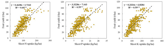 Relationships between observed fruit yield and N, P, and K uptake in the shoot dry matter at all sites in watermelon production areas in China. Dotted line represents the linear regression line. Two asterisks (**) represent the significance at the 0.01 level.