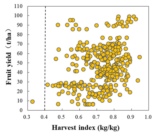 To determine the maximum accumulation (YA) and maximum dilution (YD) borderlines using the QUEFTS model, HI data that were less than 0.4 were excluded, because a lower HI indicated that plant growth was influenced by limitation factors other than nutrients [19,54]. As shown in Figure 2, only one HI observation was below 0.4. For all watermelon data, HI in this study ranged from 0.33 to 0.95 with an average of 0.72 (Figure 2), which was similar to the HI values in potato plantations [33].