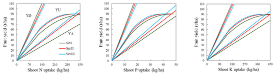 Relationships between fruit yield and nutrient uptake of watermelon at different sets of constants a and d. Set I, II, and III excluded the upper and lower 2.5th, 5.0th, and 7.5th percentiles of all internal efficiency (IE) data, respectively. YD, YA, and YU represented the maximum dilution, maximum accumulation, and balanced uptake of N, P, or K in the shoot, respectively. The yield potential was set at 90 t/ha.