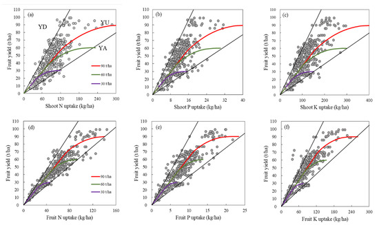 Relationships between fruit yield and N, P, and K accumulation in the shoot dry matter (a–c) and fruit (d–f) under different potential yields predicted by the Quantitative Evaluation of the Fertility of Tropical Soils (QUEFTS) model. YD, YA, and YU represent the maximum dilution, maximum accumulation, and balanced uptake of N, P, and K in the shoot dry matter or in the fruit dry matter, respectively. These parameters were calculated by the QUEFTS model after excluding the upper and lower 5th percentiles of all internal efficiency data (HI ≥ 0.4). The potential yield ranged from 30 to 90 t/ha.