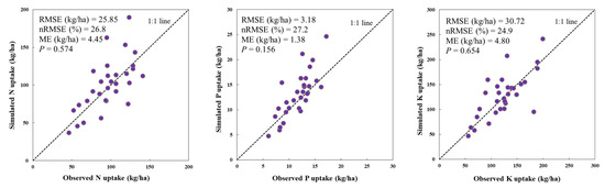 where si and mi represent the values of simulated and measured nutrient uptake (kg/ha), respectively; n is the number of values; and represents the average value of measured nutrient uptake (kg/ha). The equations of RMSE and ME measure the average discrepancy between the simulated and measured data with the same unit (kg/ha), while the n-RMSE equation does not consider the unit and enabled comparisons among values with different units [49]. The SPSS 20.0 software (SPSS Inc., Chicago, IL, USA) was utilized to analyze the significant differences between the means of simulated and observed values using the t-test at the 5% significance level. All charts were completed with Microsoft Office Excel (2013) software (Redmond, Washington, USA).