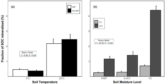 The proportion of SOC mineralized as CO2 during the incubation period was affected by soil temperature, moisture, and by an interaction of grazing × temperature, and temperature × moisture (Table 1). At 5 °C, the proportion of SOC mineralized as CO2-C was <0.5%, but at 25 °C reached as high as 2.9% (Figure 2a). Within the AMP soils, SOC mineralization was 3.7 times greater at 25 °C than at 5 °C, while in non-AMP soils this increase was 5.6 times (Figure 2a). Increasing soil moisture and soil temperature both increased the proportion of SOC mineralized (Figure 2b), though high temperature (25 °C) and high moisture (i.e., FC) in combination increased CO2-C mineralization by as much as 17+ fold relative to soils at low temperature where moisture was below FC (Figure 2b).