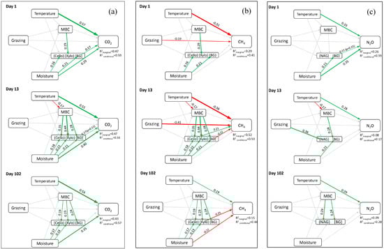 The use of SEM evaluating CO2, CH4, and N2O responses to the grazing regime, temperature, and moisture conditions during incubation, as well as the associated MBC and EEA levels, revealed marked differences among GHGs, and the sampling times during incubation (Figure 3; Table S2).